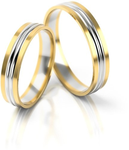 Obrączki ślubne płaskie z liniami na środku 4mm dwukolorowe żółte i białe złoto próba 585