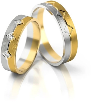 Obrączki ślubne płaskie 5mm z liniami i diamentami dwukolorowe białe i żółte złoto próba 585