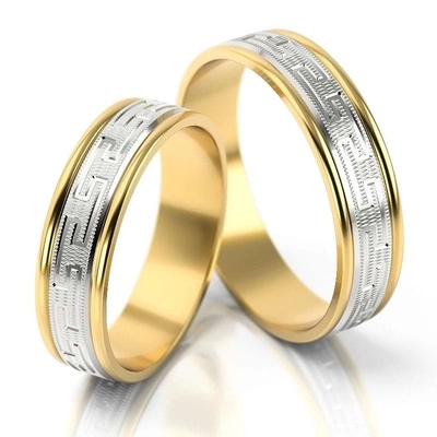 Obrączki ślubne płaskie ozdobione wzorem 5mm dwukolorowe białe i żółte złoto próba 585