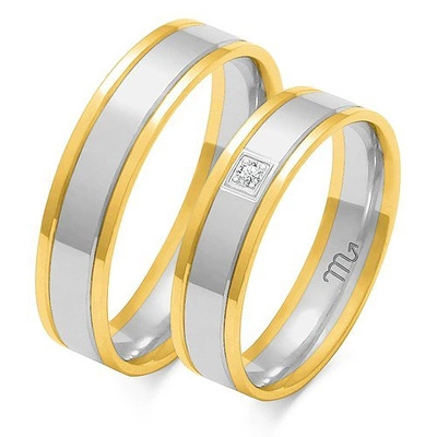 Obrączki ślubne płaskie ozdobione liniami i diamentem 5mm dwukolorowe białe i żółte złoto próba 585
