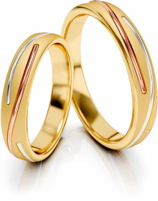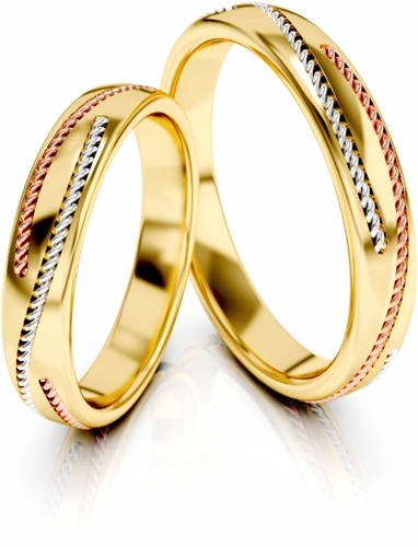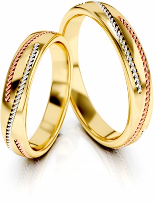 Obrączki ślubne półokrągłe 4mm z ozdobnymi liniami trójkolorowe próba 585
