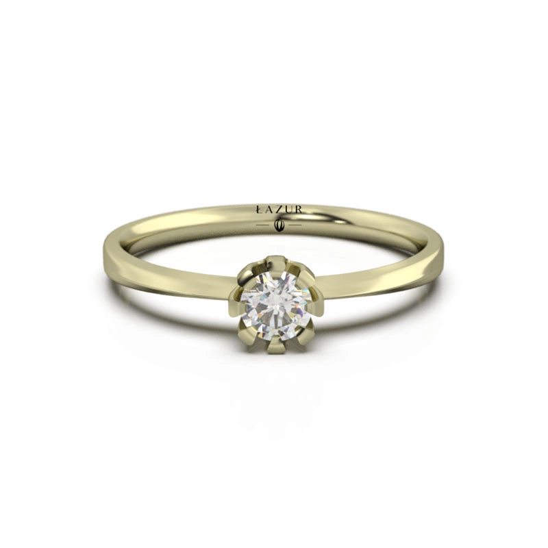 - TERMIN REALIZACJI W 7DNI DOSTĘPNY DLA ROZMIARÓW 11-16. Pierścionek zaręczynowy z brylantem w koszyku z ośmioma delikatnymi łapkami, gwarantującymi mu bezpieczne i piękne wyeksponowanie.