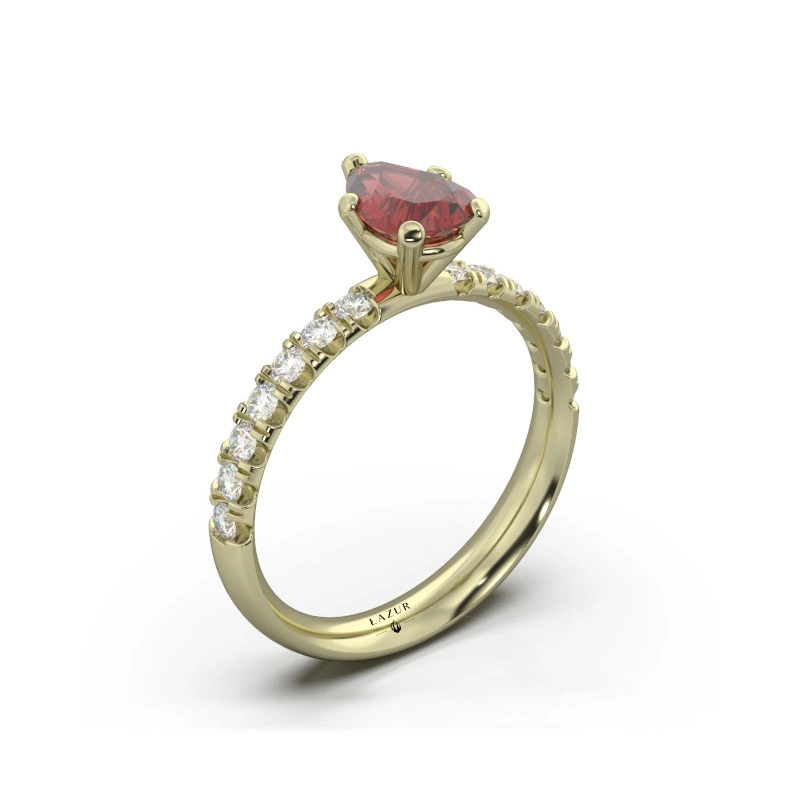 Oryginalny pierścionek zaręczynowy z czerwonym granatem o kształcie łezki z 20 małymi brylantami. Nowoczesna forma pierścionka jest idealnym wyborem dla odważnej kobiety, która nie boi się wyzwań.