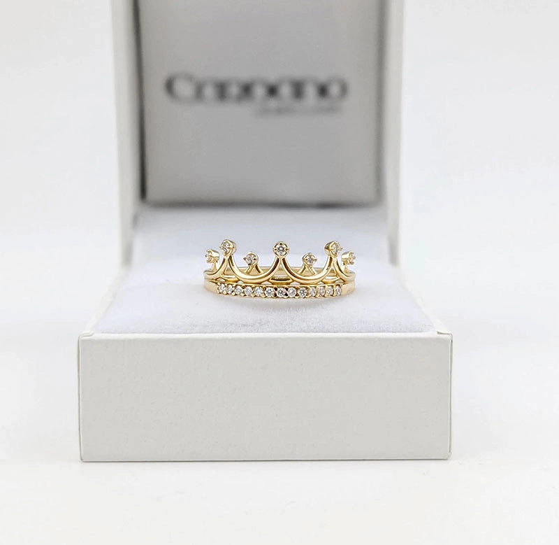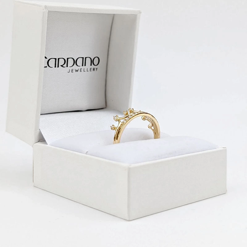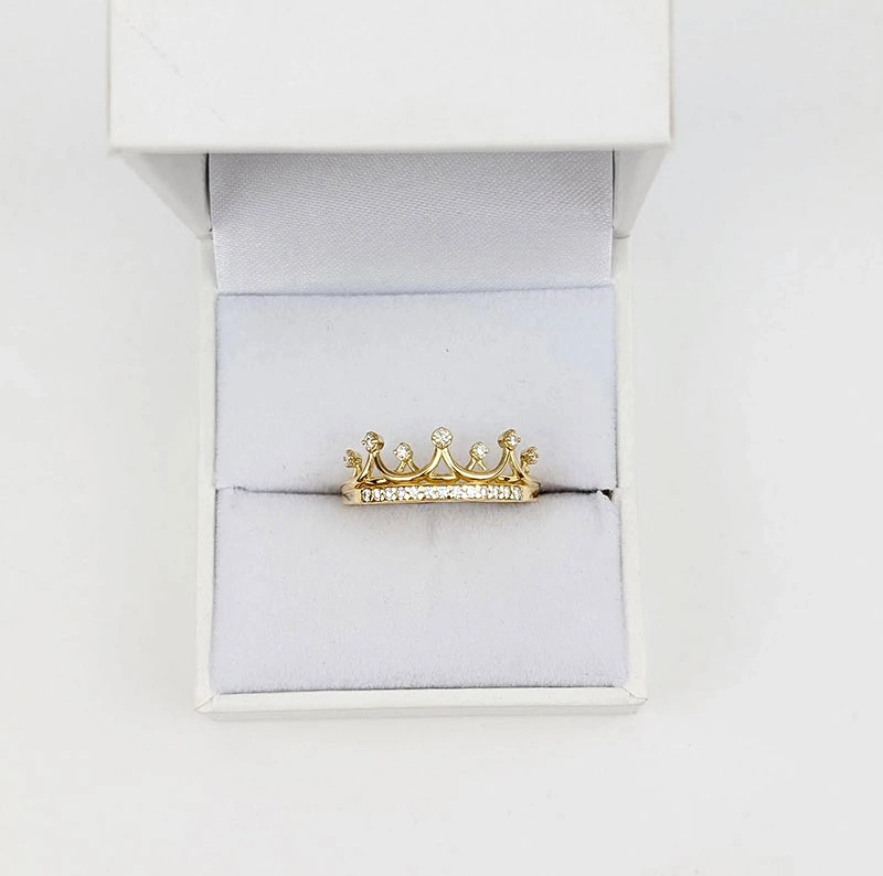 - Bogato zdobiony, złoty pierścionek z brylantami w kształcie królewskiej korony. Jego podstawa została wysadzona wiankiem 13 brylantów, które znajdują kontynuację w górnej części korony. Doceni go tylko królowa Twojego serca.