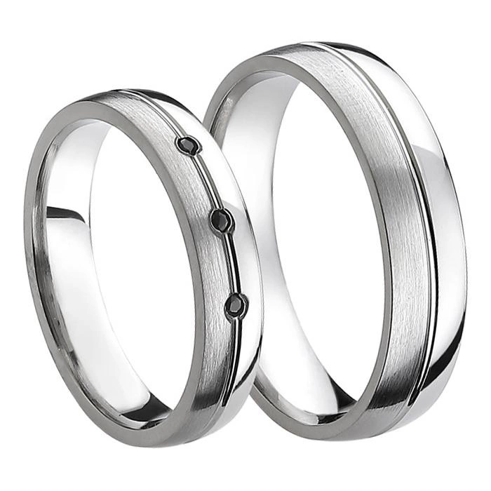 Tytanowe obrączki ze wzorem i czarnymi kamieniami.