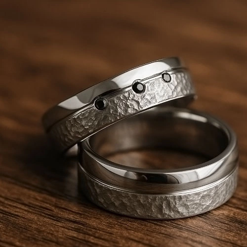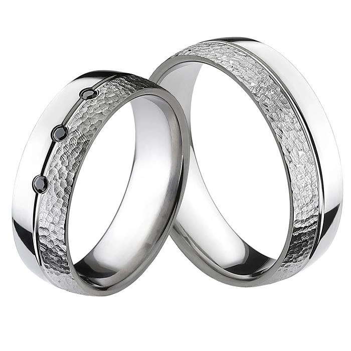 Tytanowe obrączki z młotkowaniem i czarnymi kamieniami.