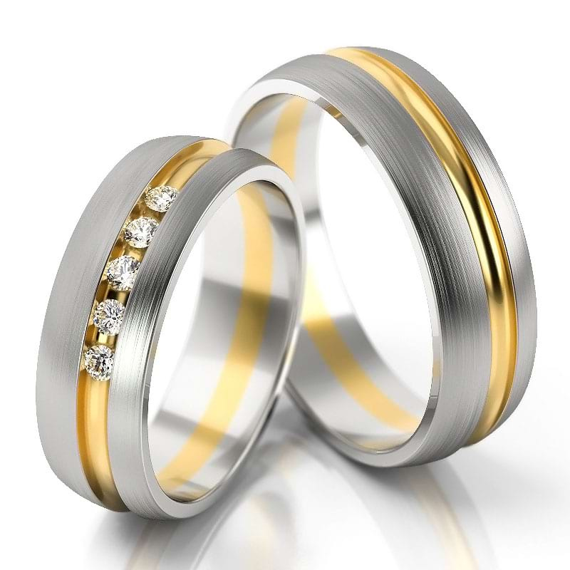 Obrączki ślubne półokrągłe z fugą i diamentami 6mm dwukolorowe białe i żółte złoto próba 585