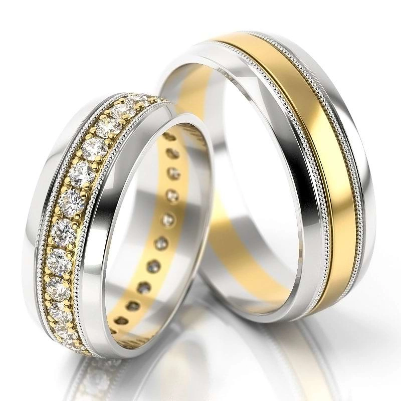 Eleganckie obrączki ślubne półokrągłe 6,5mm z milgryfami dwukolorowe białe i żółte złoto próba 585
