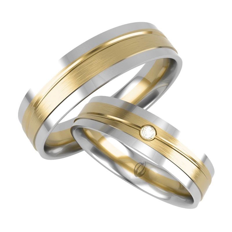 Obrączki ślubne płaskie 5mm z linią i kamieniem dwukolorowe żółte i białe złoto próba 585