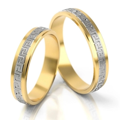 Płaskie obrączki ślubne z greckim wzorem 4mm dwukolorowe żółte i białe złoto próba 585