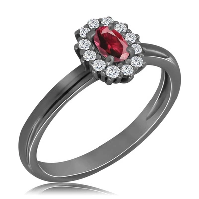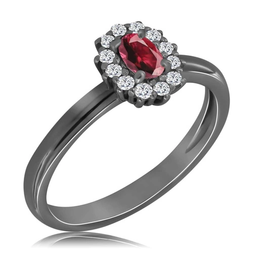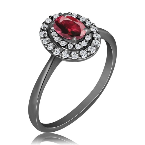 Czarny pierścionek z rubinem i diamentami oraz sercami po bokach