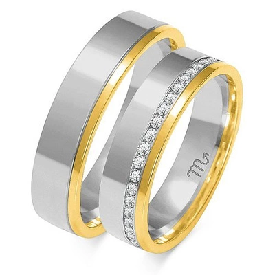 Obrączki ślubne płaskie z kamieniami 5mm dwukolorowe z białego i żółtego złota próba 585