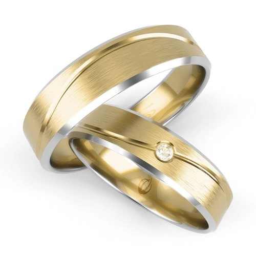 Obrączki ślubne płaskie ozdobione liniami i diamentem 5mm dwukolorowe białe i żółte złoto próba 585