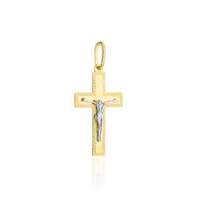 Krzyżyk złoty zdobiony diamentowaniem z Jezusem w dwóch kolorach złota średni