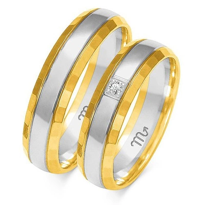Obrączki ślubne półokrągłe z falami i diamentem 5mm dwukolorowe z żółtego i białego złota próba 585