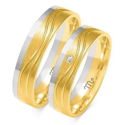 Obrączki ślubne płaskie ozdobione liniami i diamentem 5mm dwukolorowe białe i żółte złoto próba 585