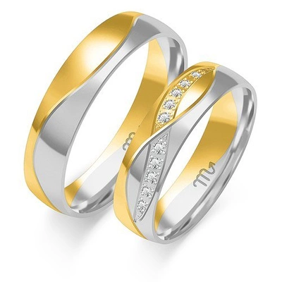 Obrączki ślubne z falami i kamieniami 5mm dwukolorowe z białego i żółtego złota próba 585