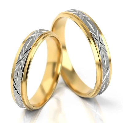 Obrączki ślubne płaskie z liniami na środku 4mm dwukolorowe żółte i białe złoto próba 585