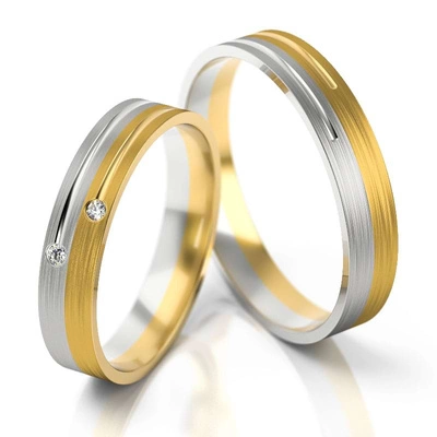Obrączki ślubne lekko zaokrąglone 4mm z liniami i kamieniem dwukolorowe złoto próba 585