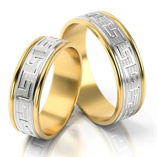 Obrączki ślubne płaskie z greckim wzorem 6mm dwukolorowe białe i żółte złoto próba 585